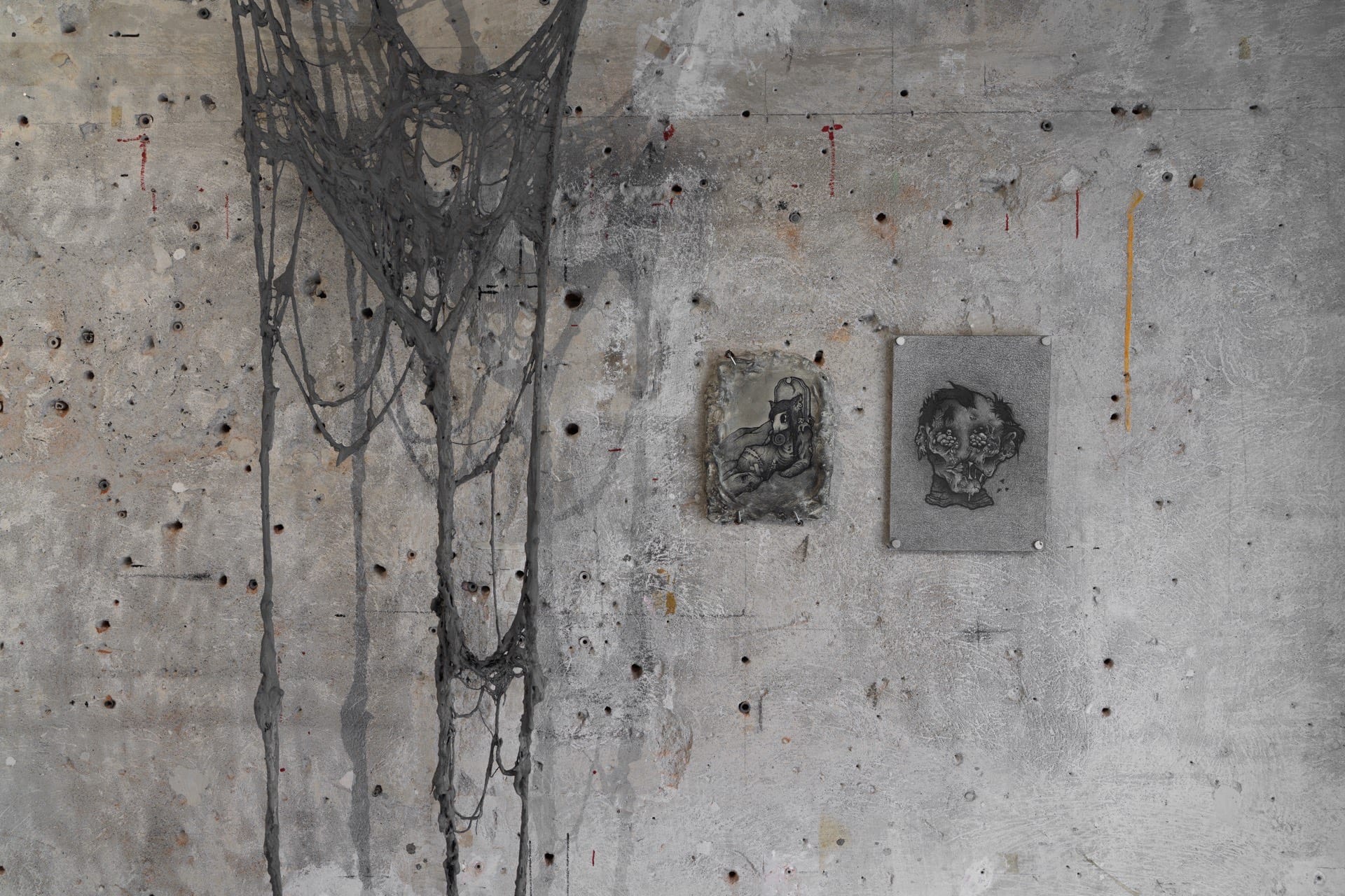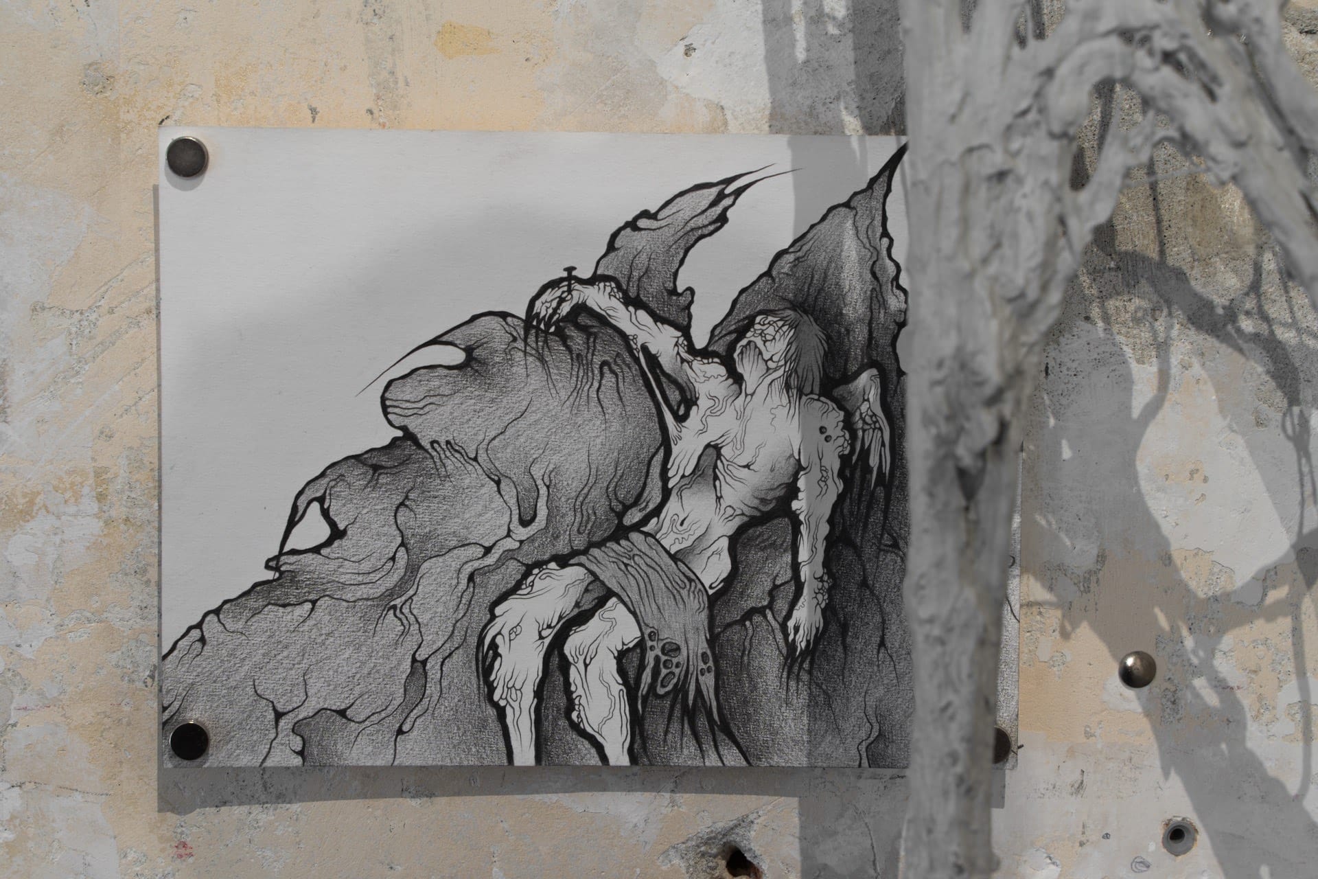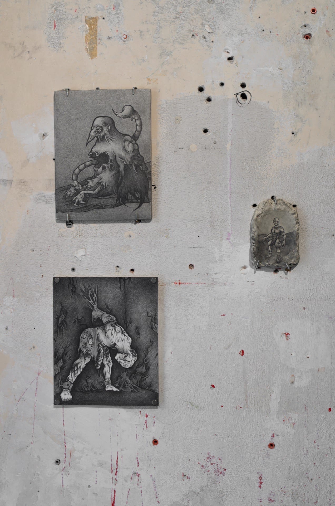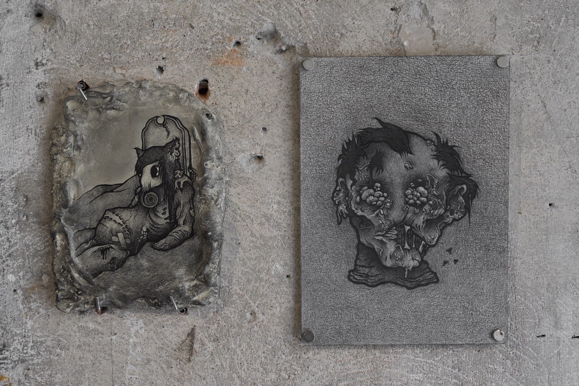1. Injured, 2023, graphite on air-dry clay, 20.2x15.6cm 2. Rotting, 2023, graphite on paper, 25x18cm
