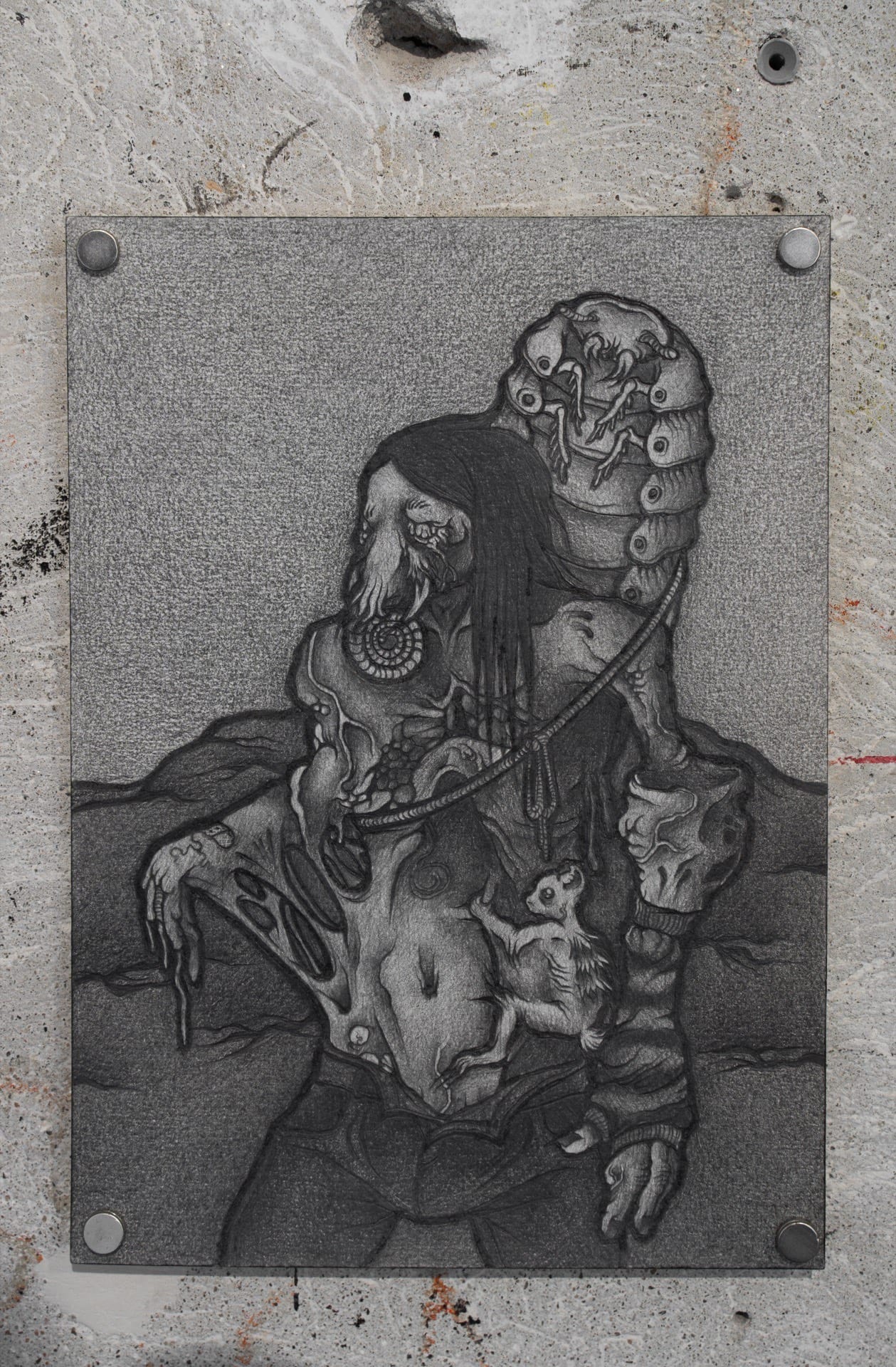 1. Endless Crawl, 2025, graphite on ceramics, 44x29cm, 2. Hidden Vermin, 2025, graphite on ceramics, 42x25.5cm